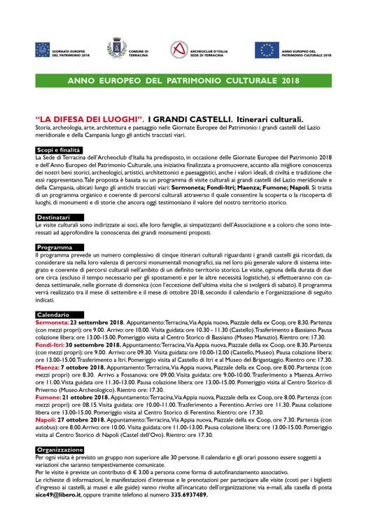 Tale proposta è basata su un programma di visite culturali ai grandi castelli del Lazio meridionale e della Campania, ubicati lungo gli antichi tracciati viari: Sermoneta, Fondi-Itri, Maenza, Fumone, Napoli.