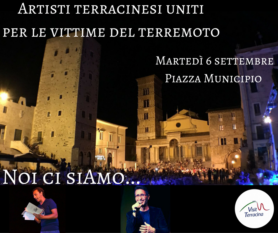 Terracina scende in campo per i terremotati. Tanti artisti terracinesi tutti insieme, in una giornata unica nel suo genere, per sostenere le popolazioni terremotate. Appuntamento per questa sera in Piazza Municipio: a partire dalle 18 si esibiranno le più importanti scuole di danza della città insieme a tanti altri artisti della musica e della recitazione. Lo show pomeridiano sarà condotto da Mimmo De Rosa.