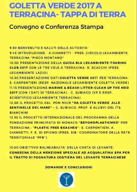 Il Convegno e Conferenza Stampa “ Goletta Verde 2017 a Terracina- Tappa di Terra: la qualità delle spiagge e del mare per un turismo sostenibile” si svolgerà mercoledi’ 5 luglio 2017 alle ore 9.30-13.30, presso la Sala Riunioni della Capitaneria di Porto di Terracina a Via del Molo 22, organizzato dal Circolo Legambiente Terracina "Pisco Montano", da Legambiente Nazionale - Goletta Verde e da Legambiente Lazio, con il patrocinio del Comune di Terracina, della Guardia Costiera-Capitaneria di Porto di Terracina e del Programma “Beyond Plastic Med – Progetto Plastic Free Beaches” della Fondazione del Principato di Monaco e in collaborazione con l’Istituto A. Bianchini di Terracina, ed è parte della campagna nazionale “Goletta Verde 2017”.