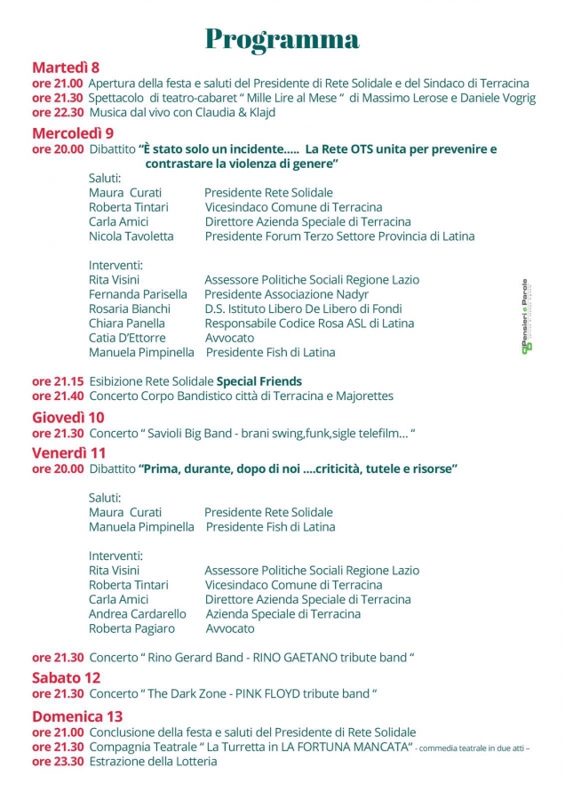 Dall'8 al 13 agosto presso l’area de “ La Pinetina” a Terracina si svolgerà la quarta edizione di Solidarietà in Festa. Anche quest'anno la festa si caratterizza come meeting delle associazioni del Terzo Settore, luogo di confronto e proposta, occasione per riflettere sui temi dell'emarginazione, del disagio e sulle buone prassi inclusive. Quest'anno verranno affrontati tre temi particolarmente rilevanti: "È stato solo un incidente! la Rete OTS unita per contrastare la violenza di genere!" (9 agosto ore 20); "Terzo Settore: cambio di passo! Le prospettive e i cambiamenti illustrati dall'on. Bobba dopo l'approvazione dei decreti attuativi" (giovedì 10 agosto ore 20); "Prima, durante, dopo di noi ....criticità, tutele e risorse” (11 agosto ore 20)