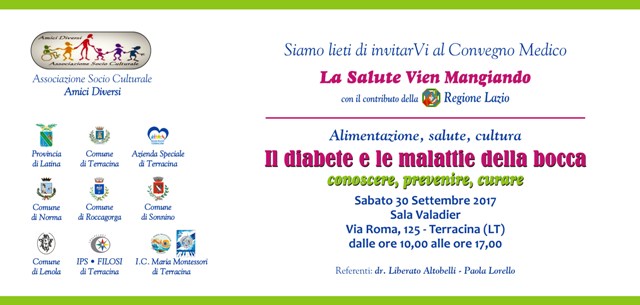 L’associazione di Promozione Sociale “Amici Diversi” con il contributo della Regione Lazio organizza per Sabato 30 Settembre, il primo convegno Medico - Scientifico sulle problematiche diabetologiche e le Malattie della Bocca, a Terracina nella sala Valadier in via Roma n°125. L’iniziativa che vede il patrocinio della provincia di Latina,dei Comuni di Terracina, Lenola, Norma, Roccagorga e Sonnino, nonché il coinvolgimento dell’Azienda Speciale “Terracina” e la preziosa collaborazione degli istituti Filosi e Montessori di Terracina, vuole far il punto su alcune delle patologie prevalenti dei nostri giorni, il Diabete e le Malattie della Bocca. Il diabete colpisce inesorabilmente giovanissimi e anziani e le cause sono sia di natura genetica che ambientale. Questo rende molto difficile, se non impossibile, predire l’insorgere di questa malattia. Quello che, invece, non solo è possibile, ma anche indispensabile è la prevenzione. Il convegno nasce con questo scopo. Diabetologo, endocrinologo e nutrizionista illustreranno le varie sfaccettature, i danni e ovviamente la prevenzione e le cure del diabete, definito da molti, la malattia del benessere. Gradino sociale diverso, invece, per le Malattie della Bocca, sempre più diffuse nella nostra società fra le classi medio/basse. Per pigrizia, per paura e soprattutto per denaro, si tendono a trascurare alcune semplici patologie, che si trasformano in problemi seri e che coinvolgono il cavo orale. Nel corso del convegno sarà presentato il progetto P. I. M. O. S. (Progetto Italiano Medici Odontoiatrici nel Sociale) e l’idea di istituire alcune poltrone, per accogliere i pazienti meno abbienti. Saranno presentati i medici che aderiscono all’iniziativa ed illustrate le modalità per aderire al progetto ma soprattutto, saranno divulgate le prime semplici regole per una corretta igiene orale casalinga. Dinamico ed articolato il programma della giornata, i lavori cominceranno alle ore 10.00 di Sabato 30 Settembre con l’intervento del delegato alla sanità del comune di Terracina la dottoressa Maurizia Barboni al quale seguiranno i saluti del Sindaco, Nicola Procaccini poi si entrerà nel vivo del dibattito. Il dottor Alessandro Spalletta illustrerà la rete dei servizi che è a disposizione del paziente fragile; mentre di formazione nell’approccio con il paziente e dell’aspetto psicologico nella cura, se ne occuperanno rispettivamente Francesco Di Mattia e Francesco Cifariello. Si parlerà di diabete ed Alimentazione con Mimmo Miele e Virgilio Colasanti mentre, gli aspetti psicologici nel diabete cronico, saranno trattati da Analiliana Costache. Sarà Filippo Fordellone, il Presidente del PIMOS, ad illustrare il progetto italiano sociale dei Medici Odontoiatrici. A chiudere i lavori sarà il dottor Liberato Altobelli, promotore del convegno.