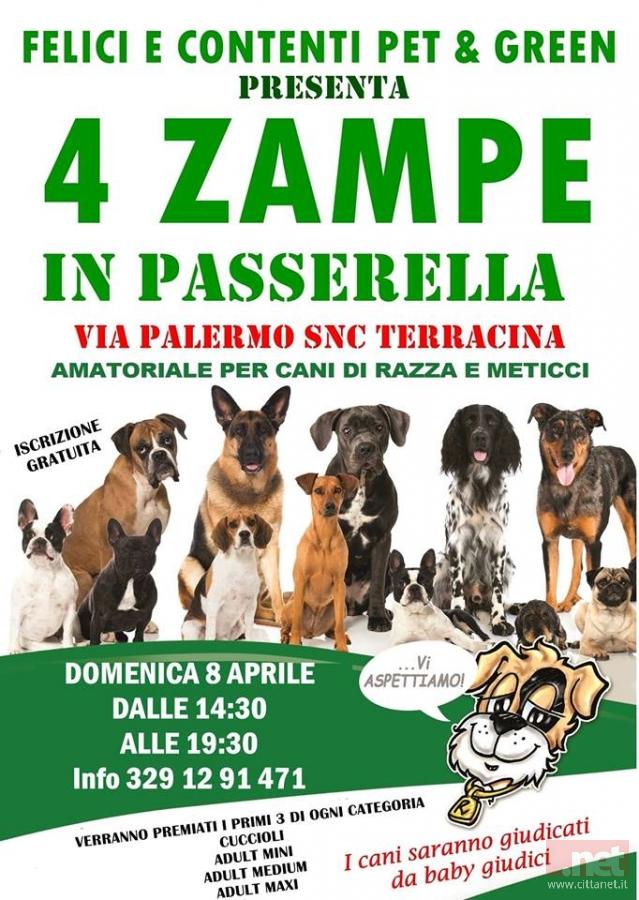 Si terrà a Terracina, domenica 8 aprile, dalle ore 14:30 alle 19:30, in via Palermo, l’esposizione amatoriale per cani di qualsiasi taglia, razza ed età. È possibile effettuare le iscrizioni dal 19 marzo presso il negozio “Felici e contenti pet & green qualità per la natura che ami” in via Palermo a Terracina, per informazioni è possibile contattare il numero 329 12 91 471. Tutti i cani in gara saranno giudicati da una giuria composta esclusivamente da bambini. Verranno premiati i primi tre cani delle seguenti categorie: cuccioli da 3 a 12 mesi; adulti di taglia piccola (fino a 15 kg); adulti di taglia media (da 16 a 35 kg); adulti di taglia grande (da 36 kg e oltre). Tutti i cani devono essere vaccinati e con microchip. La manifestazione è gratuita e a carattere ludico didattico. Durante la manifestazione è possibile acquistare e donare crocchette ai cani meno fortunati. Nel corso dell’appuntamento ci sarà una dimostrazione di ubbidienza e una spiegazione su come educare il proprio cane. L'organizzazione non è responsabile di danni ricevuti o provocati, ognuno è responsabile di se stesso e del proprio cane.