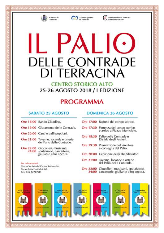 Il 25 e il 26 agosto si svolgerà a Terracina, nel Centro Storico alto, la I edizione del “Palio delle Contrade”: una rievocazione di eventi liberamente tratti dalla documentazione storica della città del periodo medievale.