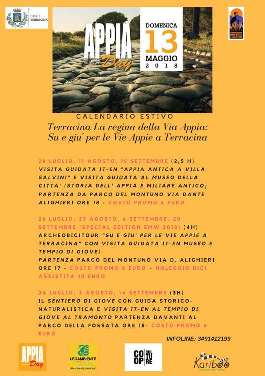 Il nostro Circolo continua a perseguire, dopo vari e importanti eventi e rassegne degli anni scorsi, e avvalendosi della preziosa collaborazione con il Comitato nazionale Appia Day e con Coopculture, l’obiettivo della valorizzazione ecoarcheologica di Terracina come “La Regina della Via Appia”, - afferma Anna Giannetti, presidente del Circolo Legambiente Terracina “Pisco Montano” - a partire dal Parco del Montuno (luogo di appuntamento e prima visita per quasi tutti gli eventi), appena riaperto con il grande contributo civico e l’impegno del Circolo, e ora in Convenzione, con la possibilità di attraversare tutti gli snodi dell’Appia Traianea e costiera, con l’ apertura al pubblico di Villa Salvini, villa storica e patrimonio unico cittadino mai aperto prima al grande pubblico, anch’essa riaperta grazie al contributo civico del Circolo e ora in Convenzione, e risalire su verso l’Appia Claudia, fermandosi al Museo della Città proprio per approfondire la storia della Via Appia con il più antico miliare mai ritrovato della Via Appia, recentemente restaurato e riaperto alla visione del pubblico proprio presso il Museo a Terracina, fino al Santuario del Tempio di Giove, attraversando il Parco degli Ausoni e il prezioso SIC (ora ZSC) di Monte S. Angelo, ricco di natura, lungo tutto il tracciato dell’Appia.