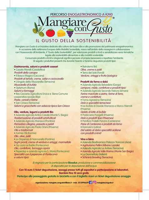 Nel suggestivo scenario di Piazza Municipio nel centro storico alto di Terracina, sabato 21 e domenica 22 settembre dalle ore 17.30 si terrà per la prima volta, “Il Gusto della Sostenibilità”, un appuntamento della rassegna “Mangiare con Gusto” dedicato al cibo e ai temi della sostenibilità.