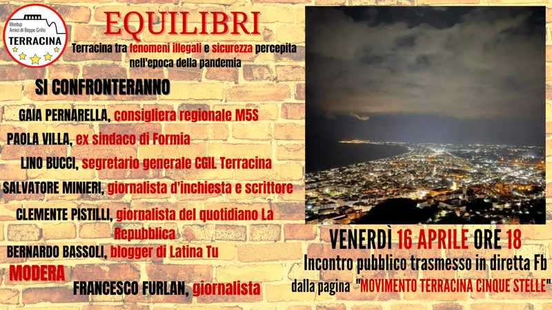 "Equilibri - Terracina tra fenomeni illegali e sicurezza percepita nell'epoca della pandemia" è il titolo dell'incontro pubblico organizzato per Venerdì 16 Aprile dal gruppo del Movimento Terracina Cinque Stelle e trasmesso in diretta a partire dalle ore 18 sull'omonima pagina Facebook. “Un approfondimento sulla realtà odierna terracinese segnata dalla pandemia mondiale, ripercorrendo la cronaca attuale e degli ultimi anni rielaborata alla luce della realtà di tutti i giorni, quella percepita dal cittadino”, così presenta l’appuntamento Anna Mattiello, organizer del gruppo terracinese.
