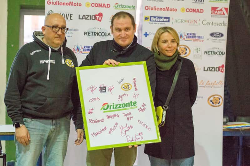 Prima della partita la società ha voluto consegnare una maglia da gioco con il logo Orizzonte al titolare Paolo Pagiaro, da sempre vicino alle vicende della Futura Terracina. Da qualche giorno tra l’altro campeggiano al PalaCarucci nuove panchina con copertura offerte proprio dalla famiglia Pagiaro.