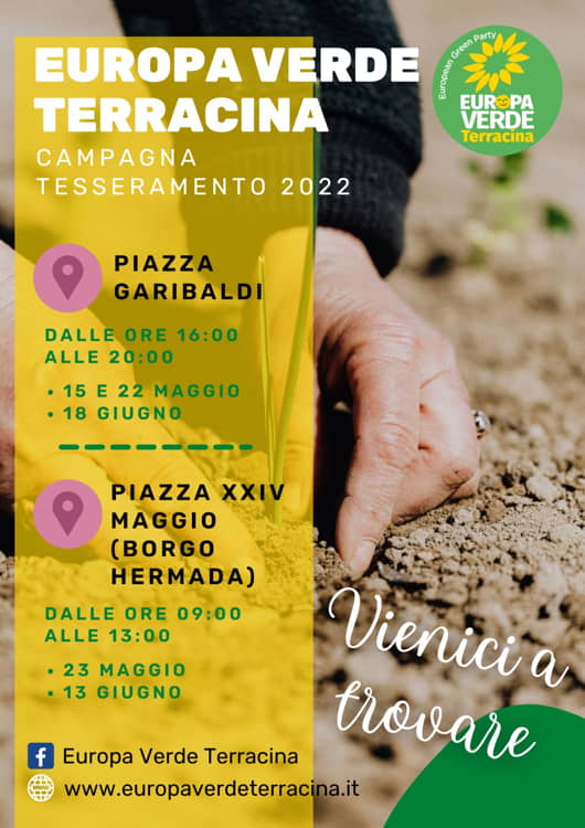 L'iscrizione ad Europa Verde può essere un atto civico e politico importante per dare forza a questo movimento nuovo per Terracina e contribuire a costruire insieme un futuro migliore, fondato sulla cura e sul rispetto dell'ambiente e dei cittadini. L’adesione ad Europa Verde è individuale e libera e implica l’accettazione dello Statuto e dei regolamenti, disponibili sul sito nazionale www.europaverde.it . Ci si può iscrivere direttamente sul sito di Europa Verde – indicando EUROPA VERDE TERRACINA- oppure se si vuole conoscere meglio i portavoce e gli attivisti di Europa Verde Terracina e il loro modo nuovo e disinteressato di fare - ed essere- cittadinanza attiva, puoi venirci a trovare ai gazebo in queste date: