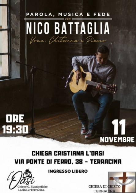 Nico Battaglia torna a Terracina a distanza di sei anni. Venerdì 11 novembre a partire dalle 19.30 il cantante di Trani delizierà il pubblico in occasione del concerto organizzato dalla Chiesa di Cristo di Via De Amicis e dalla Chiesa Cristiana L’Oasi in Via Ponte di Ferro 38 dove si terrà l’atteso evento.