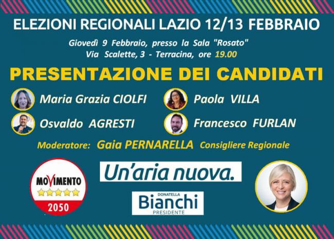 Giovedì 9 Febbraio, presso la sala “Rosato”, via Scalette, 3 – ore 19.00, si terrà a Terracina la presentazione dei Candidati Consiglieri M5S alle Elezioni Regionali del 12 e 13 Febbraio per Donatella Bianchi Presidente.