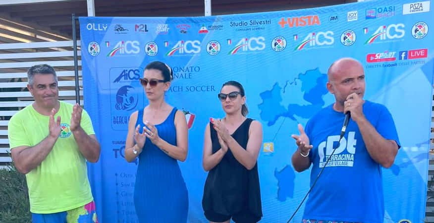 Nella foto istituzionale da sinistra Giampaolo Morsa, responsabile del settore beach soccer di Aics e presidente AiCS Lazio, Alessandra Feudi, assessore allo sport, turismo e cultura del Comune di Terracina, Sara Norcia, assessore ai servizi sociali del Comune di Terracina e Francesco Cascarini, presidente dell'associazione Amici dello Sport