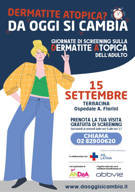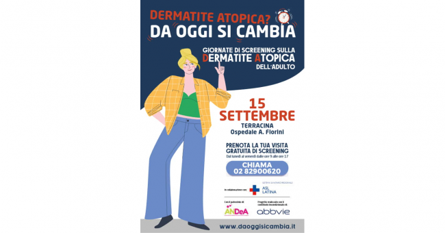 A Terracina fa tappa la campagna nazionale “Dermatite Atopica? Da oggi si cambia” realizzata con il patrocinio di ANDeA (Associazione Nazionale Dermatite Atopica), che ha lo scopo di promuovere la diagnosi e di aiutare i pazienti adulti nella remissione della malattia con appuntamenti gratuiti su prenotazione con i medici dermatologi in diversi centri ospedalieri di eccellenza in tutta Italia.