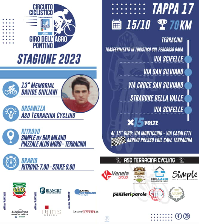 Ultima gara di questa stagione 2023 e per salutarla come si deve ci affidiamo all’asd Terracina Cyclyng di Gianluca D’Amico – commentano dalla commissione ciclistica Opes – Il XIII Memorial Davide Giuliani rappresenta un’altra classicissima da non perdere. Questa volta su percorso totalmente inedito nella prima periferia del Comune di Terracina. Circuito pianeggiante iniziale ed arrivo in salita, ultima chance per chi vuole lasciare il segno nel giro 2023.