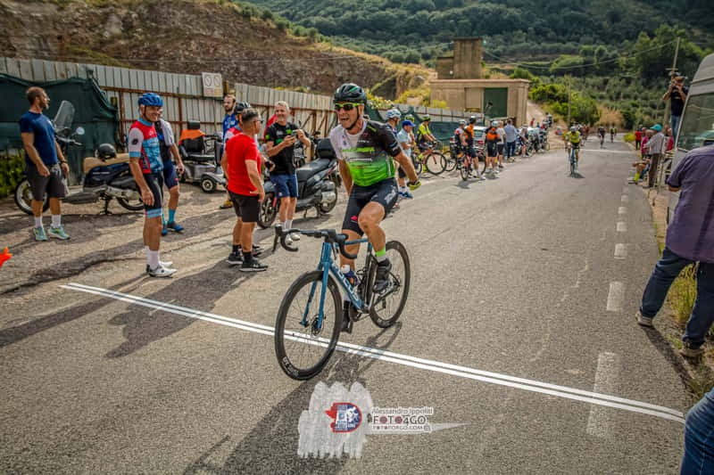 L’arrivo posto sui 3 km della salita che porta verso Campo Soriano, dava modo a chi di salita ne mastica poco, di iniziare la gara e cercare la fuga per sperare in un vantaggio finale. Ma le squadre degli scalatori non permettevano e non lasciavano spazi per poter ragionare in tal senso. Quindi gara imperiosa e veloce fino al decimo giro quando un terzetto composto da Monti Paolo, Coccoluto Paolo e Luigi Campagna, tutti e tre di categoria Neri, prendevano il largo.