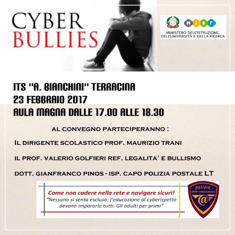 Febbraio è stato il mese della 1ª Giornata nazionale contro il bullismo e il cyberbullismo a scuola promossa dal Ministero dell’Istruzione nell’ambito del Safer Internet Day 2017, evento che si è svolto contemporaneamente in cento nazioni, e l’attenzione per questa tematica resta alta all’ITS Bianchini di Terracina