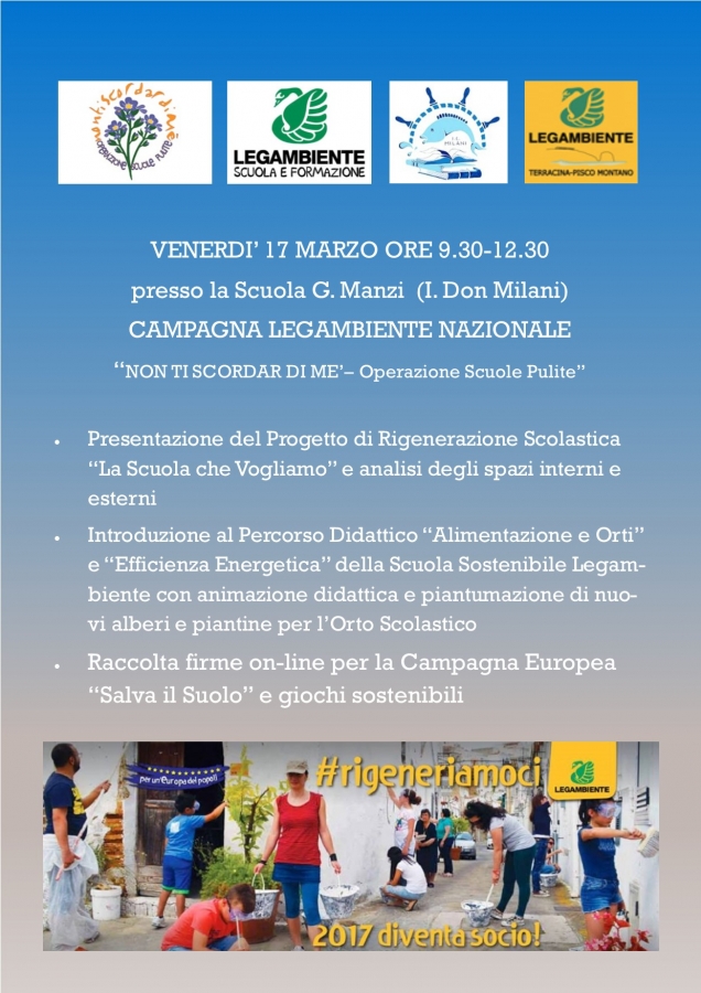 L’importante appuntamento sarà anche a Terracina Venerdì 17 marzo presso il plesso scolastico G. Manzi (dell’Istituto Don Milani) in Via Zicchieri dalle ore 9.30 alle ore 12.30 con l’intervento di volontari “rigeneratori” del Circolo Legambiente di Terracina che guideranno nella applicazione della metodologia di rigenerazione e aiuteranno a migliorare l’ambiente interno ed esterno del Plesso. Legambiente da più di dieci anni con l’indagine sulla qualità dell’edilizia scolastica, il dossier Ecosistema Scuola, e con la campagna Nontiscordardimè-Operazione scuole pulite, si rivolge agli enti locali e al mondo della scuola per sollecitare una maggiore cura degli edifici scolastici, per gli importanti valori impliciti ed espliciti che esprimono per le nostre comunità. La Giornata sarà anche l’occasione per presentare i Percorsi Didattici ed Educativi di Legambiente Scuola e Formazione “Scuole Amiche del Clima-Buone Pratiche per una scuola più smart” e “Ricominciamo dalla A Agricoltura, Ambiente, Alimentazione” con esempi e racconti a cura dei Volontari, percorsi creati con l’obiettivo importante di contribuire a formare cittadini capaci di costruire nuova bellezza. I Volontari di Legambiente piantumeranno insieme ai bambini e ai ragazzi nuovi alberi da frutta in giardino e piantine nell’Orto Didattico. Verrà anche predisposto un banchetto per la raccolta firme per la Campagna Europea #salvailsuolo e saranno effettuate attività ludiche per sensibilizzare i bambini e le famiglie sul tema importante della difesa del suolo che è un bene essenziale alla vita come l'acqua e come l'aria, ma che oggi è violentato, contaminato, avvelenato e in Europa non esiste ancora una legge comune che lo difenda.
