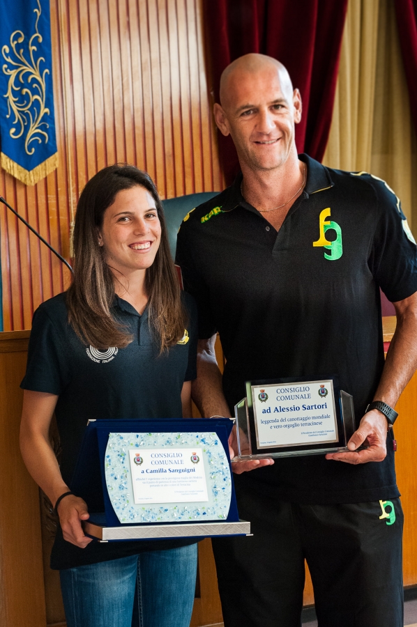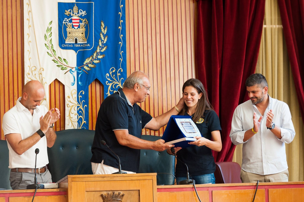 Un riconoscimento di buon auspicio per l’atleta della Futura Terracina Camilla Sanguigni che ieri pomeriggio, presso l’Aula Consiliare del Comune, ha ricevuto una targa dalle mani del Presidente del Consiglio Gianfranco Sciscione. La 15enne, che fra pochi giorni partirà alla volta di Modena per vestire la prestigiosa casacca della Liu Jo Modena, società di A1, era in ottima compagnia visto che il cerimoniale ha previsto anche un premio alla carriera per Alessio Sartori, colosso del canottaggio Mondiale, che ha deciso di abbandonare l’attività e di dedicarsi nel ruolo di allenatore, dopo innumerevoli vittorie internazionali e soprattutto l’oro olimpico a Sidney 2000. “Questo appuntamento segna l’inizio di un percorso che intendiamo intraprendere con l’amministrazione verso coloro che nobilitano il nome di Terracina – ha detto Gianfranco Sciscione-, non solo nello sport, ma anche in altri settori, come spettacolo e cultura ad esempio”. Una cerimonia semplice ma particolarmente sentita alla quale hanno preso parte molte persone che hanno occupato sia la tribuna riservata al pubblico che alcuni posti riservati ai Consiglieri Comunali. Bella e commovente in particolare la partecipazione di alcune compagne di scuola e di squadra di Camilla e di Matteo, primogenito di Alessio, di cui sentiremo parlare a breve.